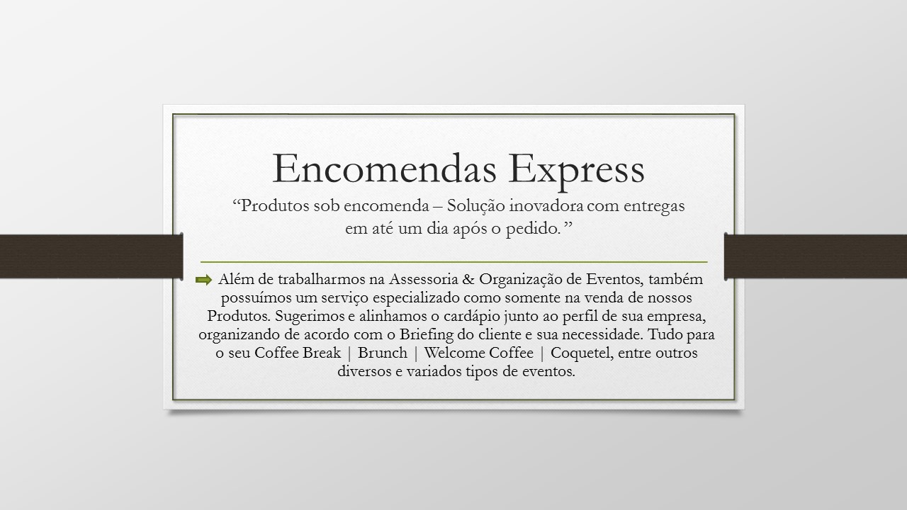 Além de trabalharmos na “Organização de Eventos” também possuímos um serviço como somente na venda de nossos Produtos, que consta em nossa pagina Cardápio Produtos.